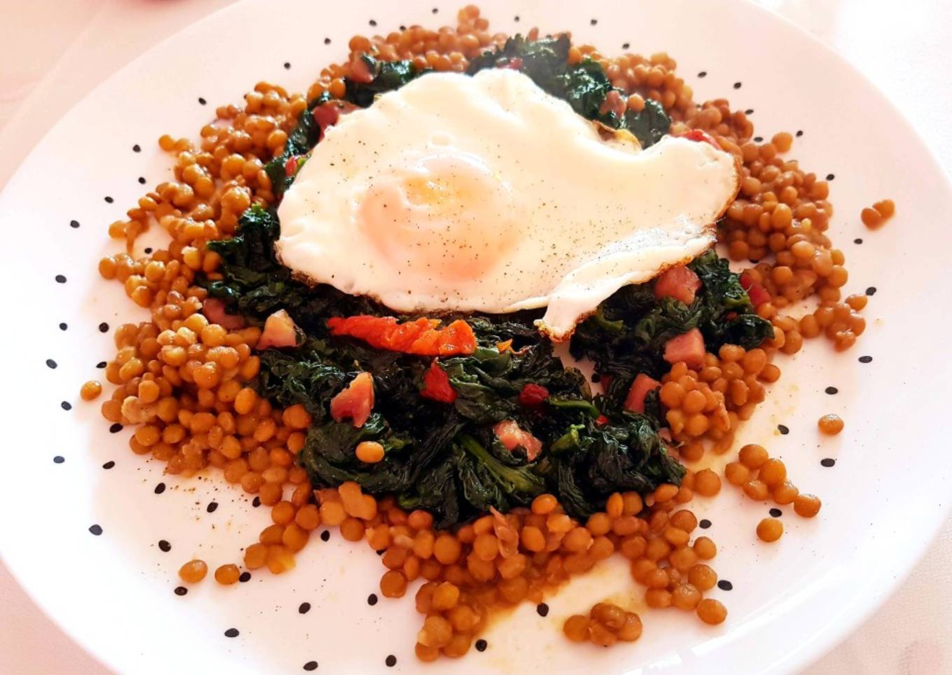 Espinacas con jamón, lentejas y huevo a la plancha