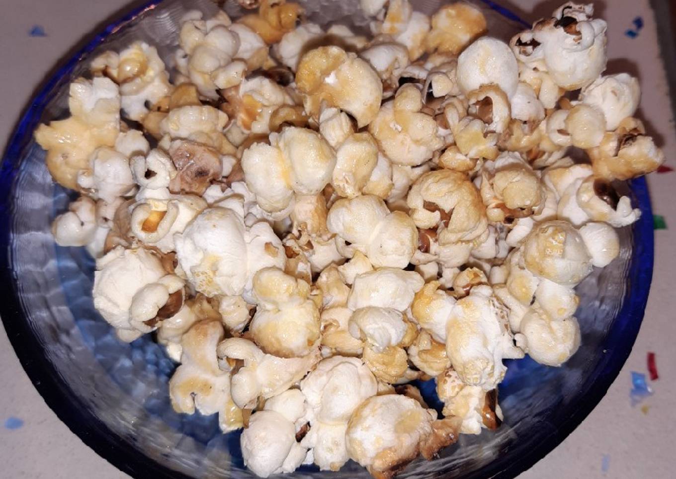 - Hacer las palomitas:se calientan 3 cuchdas AOVE+ sal.Añadir el maíz.Tapar con tapadera de cristal transparente mejor porque así se controla la explosión total de las palomitas.