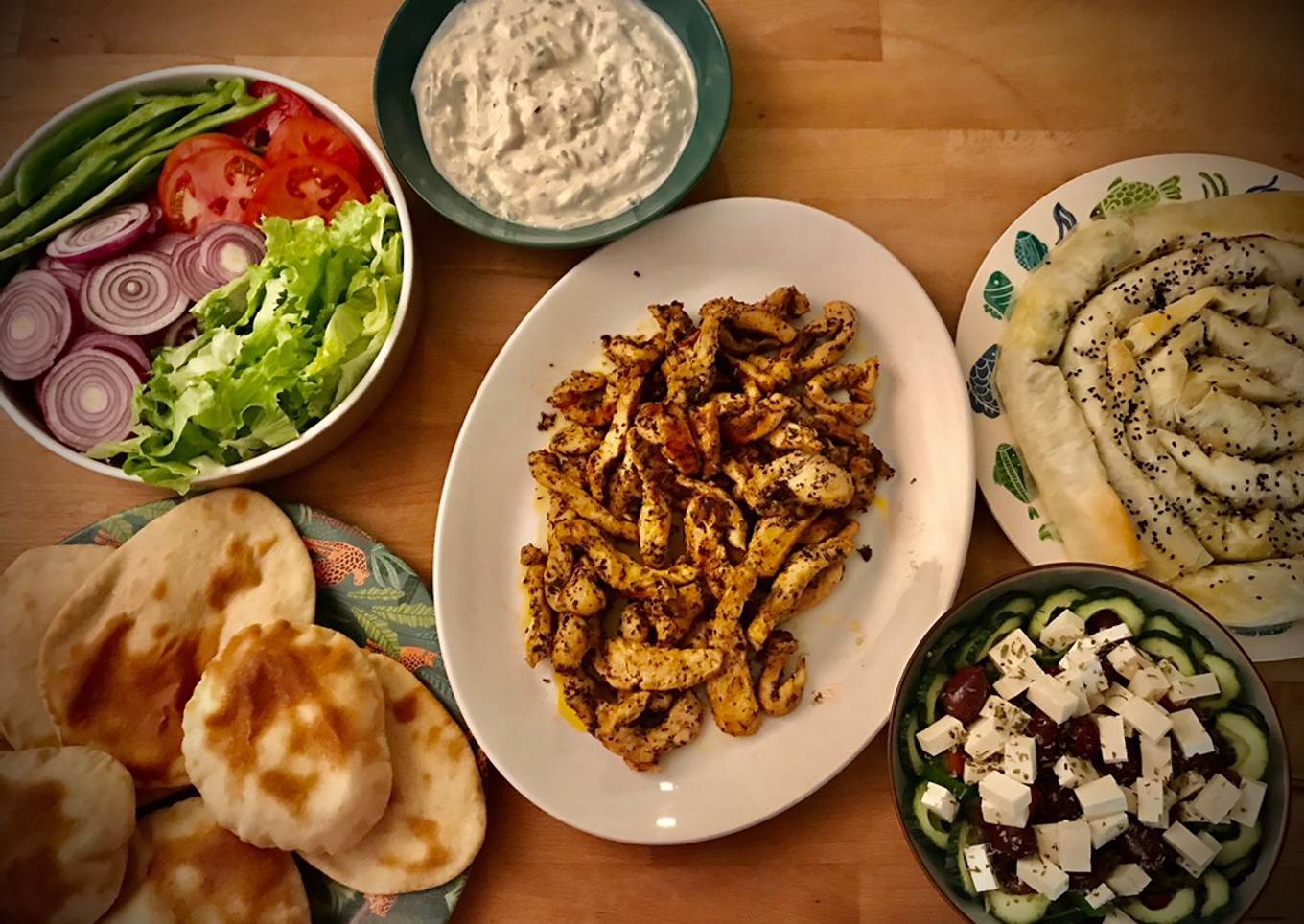 Hey everyone, it is me, Dave, welcome to my recipe site. Today, I will show you a way to make a special dish, Cena griega: Gyros de pollo con Pan Pita y Tzatziki, Spanakopita y Ensalada Horiatiki. One of my favorites food recipes. For mine, I'm gonna make it a little bit tasty. This is gonna smell and look delicious.