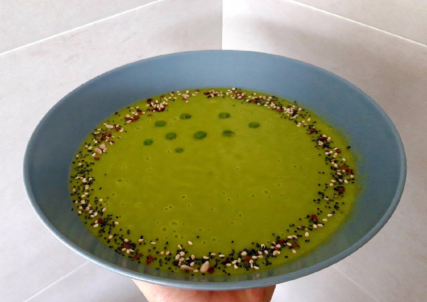 - Servimos y decoramos con unos guisantes enteros (opcional), y añadimos por encima unas semillas, picatostes, tacos de jamón... Al gusto del consumidor.