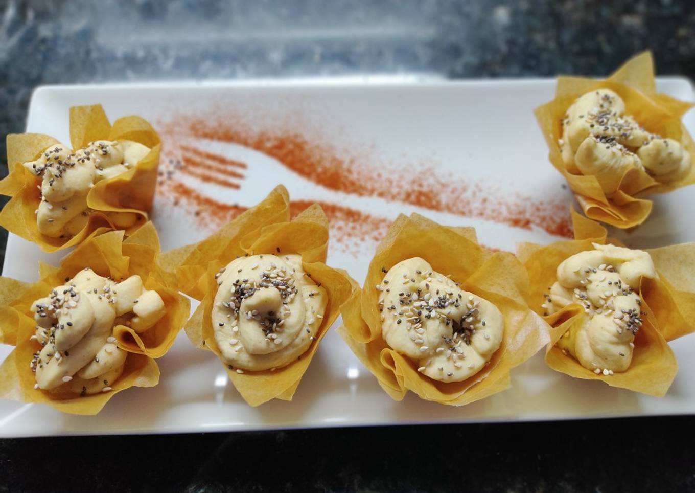 - Rellenamos la masa con el hummus, y lo decoramos con chía y sésamo.