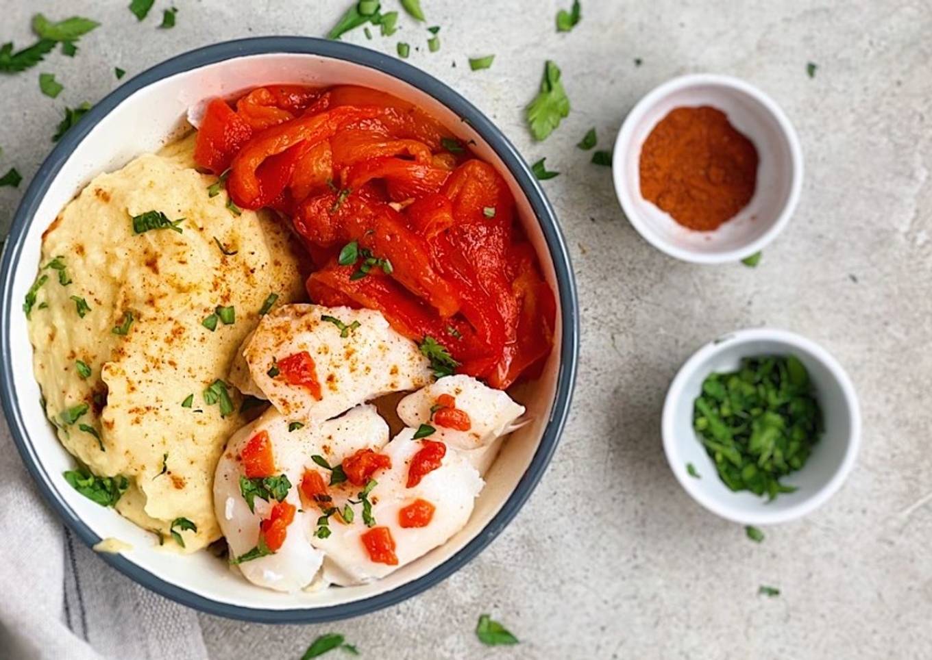 Puré de garbanzos con bacalao y pimientos rojos. Receta sana