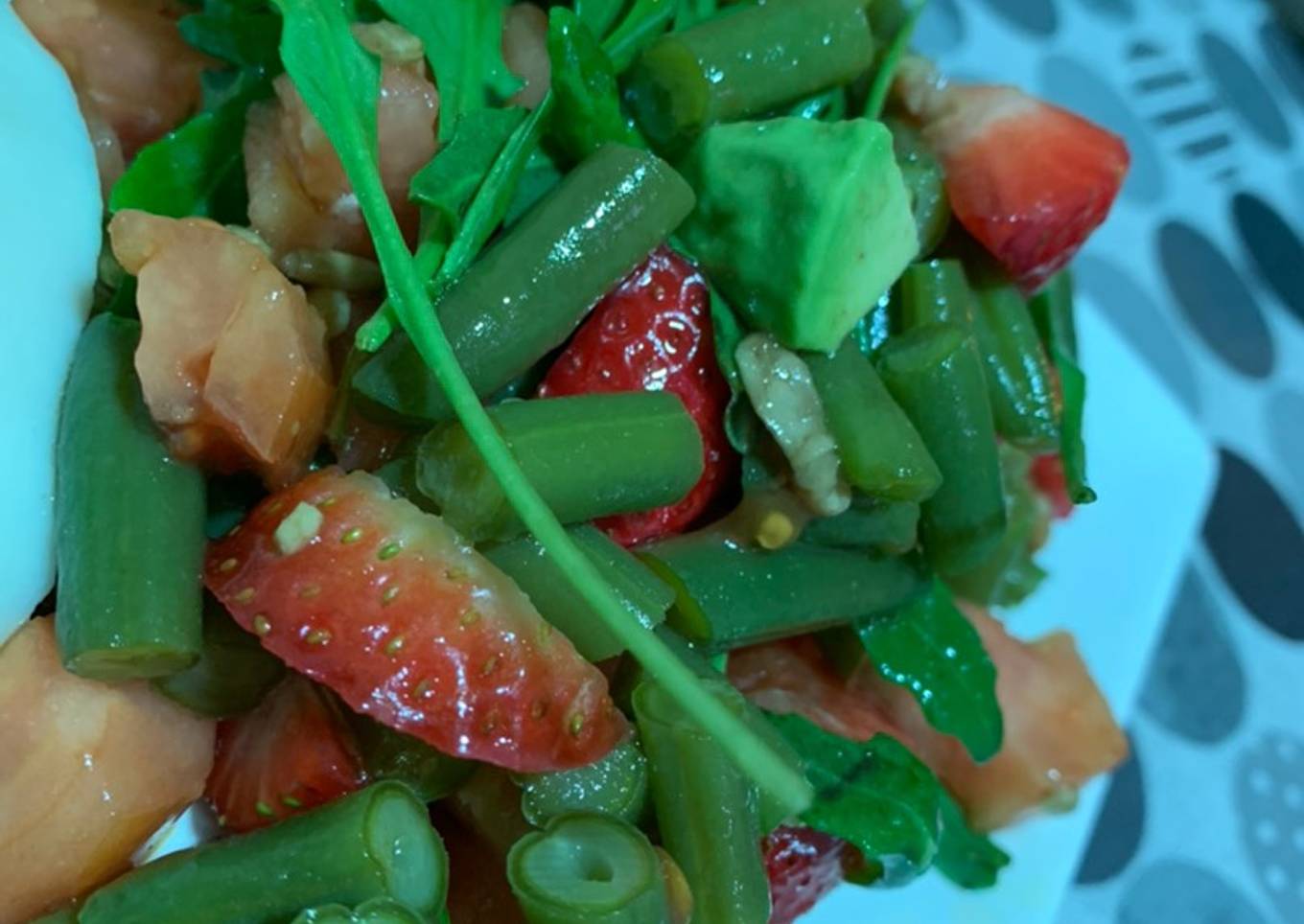 Ensalada de judía verde, aguacate, fresa, tomate y rúcula.🍓🍅🥬