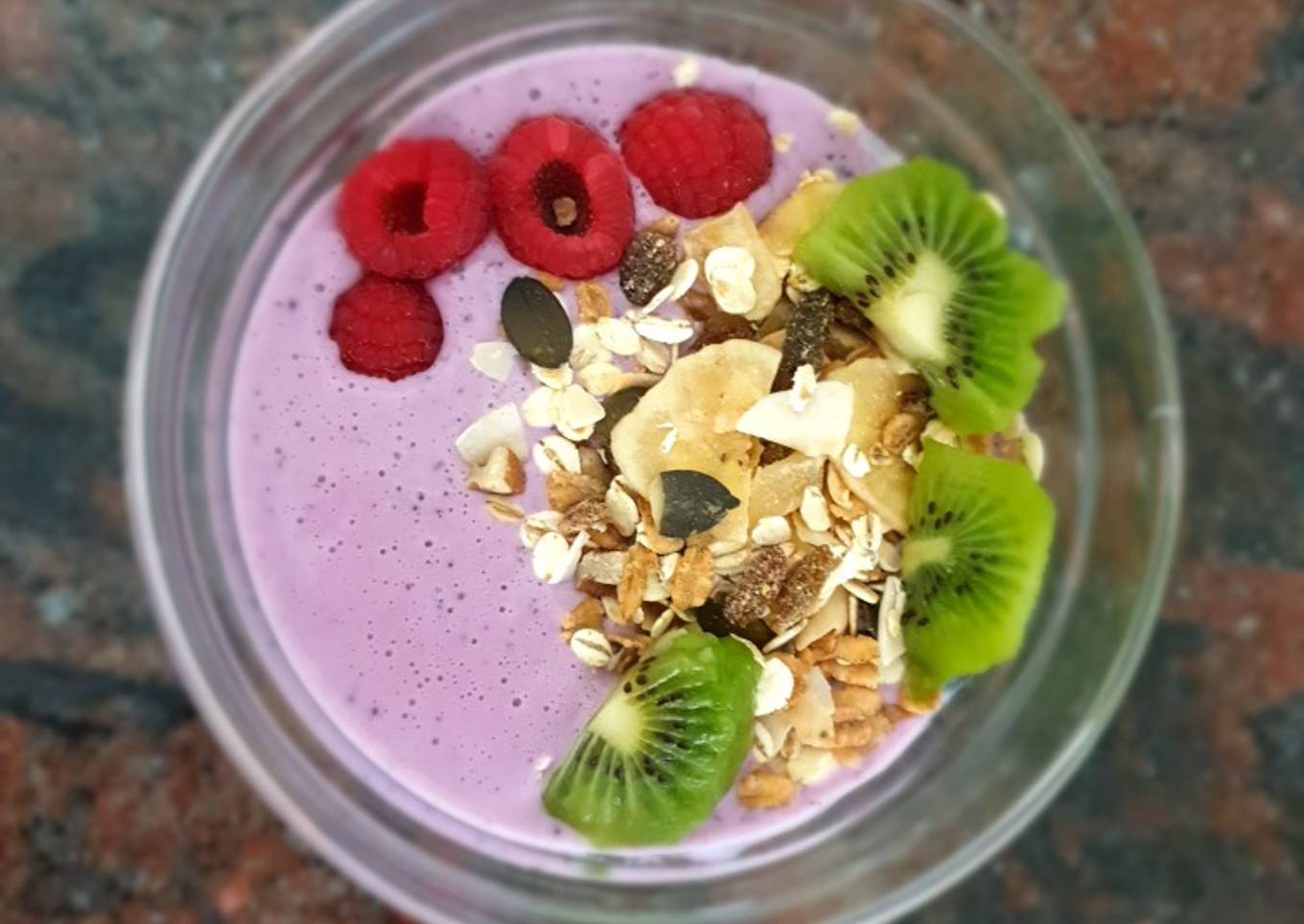 - Poner en un bol el batido, añadir el muesli y las frutas.