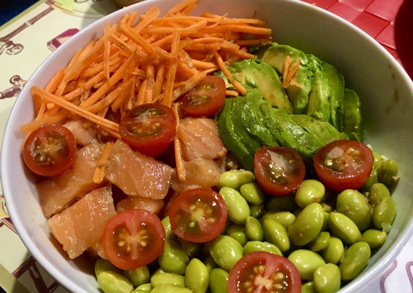 - Sobre la base anterior colocamos los “toppings”: edamames, tomates cherry, zanahoria, salmón y flor de aguacate (con especial cuidado).