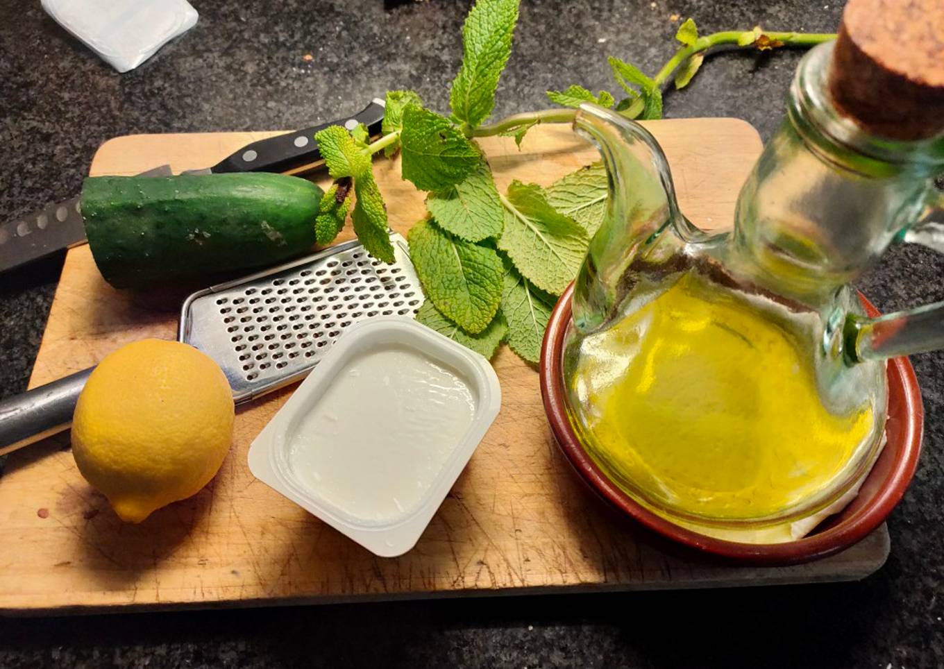 - Mezclar con el yogurt, la menta, jugo de medio limón y un chorrito de aceite. Tapar y dejar refrescar en la nevera.