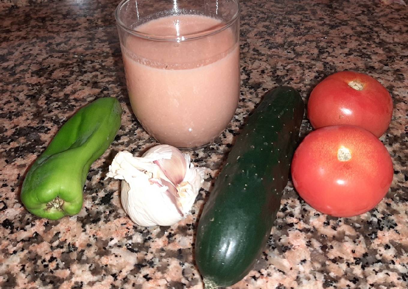 - Troceamos las verduras, las ponemos en una batidora, agregamos un poco de agua, y batimos, después añadimos el pan escurrido y más cantidad de agua, la sal, un buen chorro de aceite, y otro de vinagre, otra vez batir y finalmente se pasa por el colador y servir.