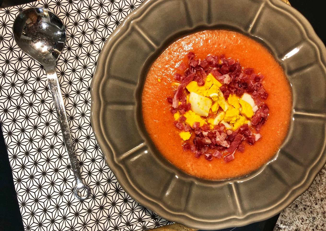 - Servimos al salmorejo en plato hondo y podemos ponerle por encima huevo cocido picadito y también unos taquitos o virutas de jamón serrano. Espero que disfrutes de esta receta y que si la cocinas me dejes una foto de Cooksnap para ver cómo te ha salido.