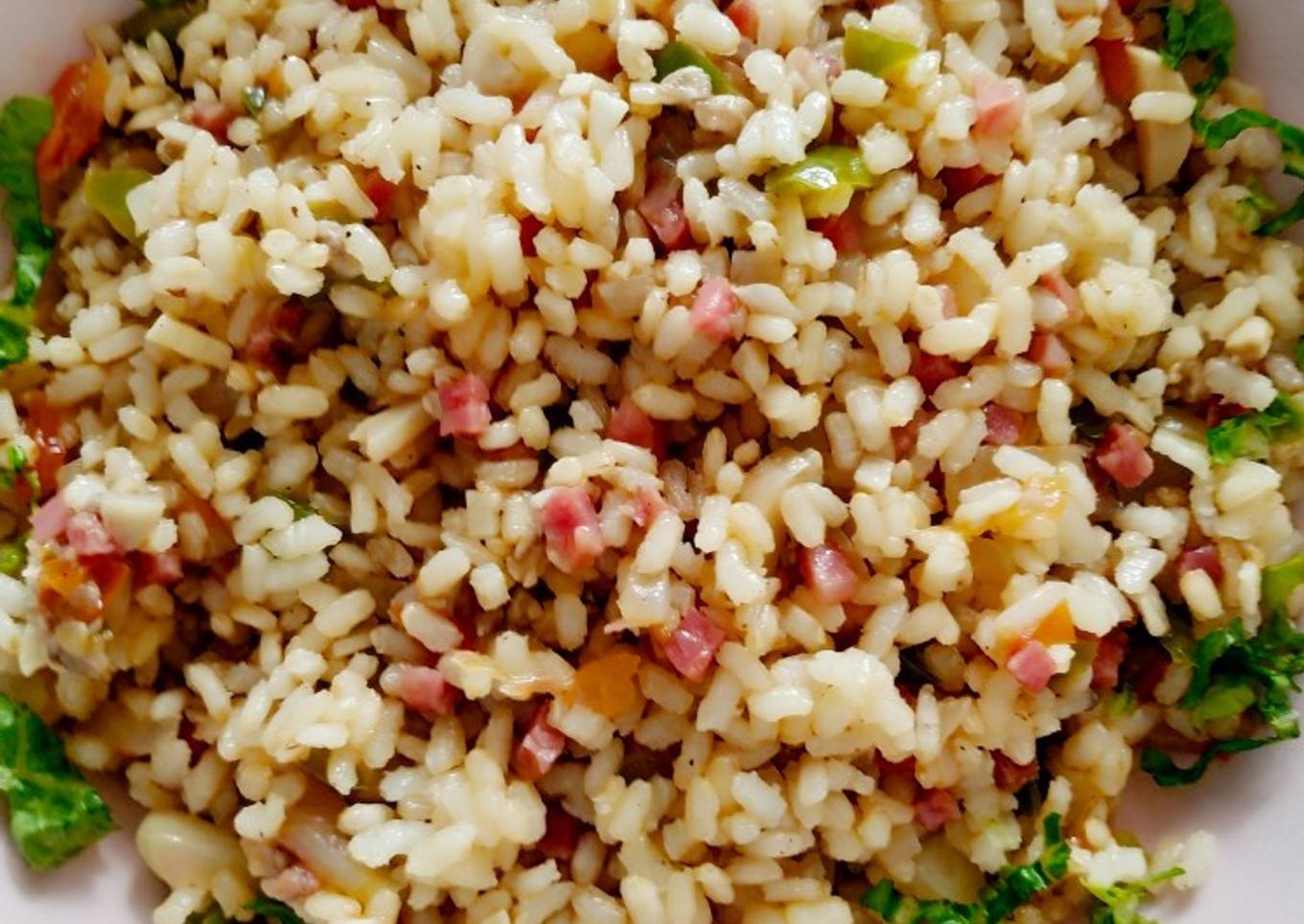 En esta receta comprende dos preparaciones que luego se mezclan. Por un lado el arroz integral seco, y aparte, taquitos de jamón serrano con champiñones y verduras.