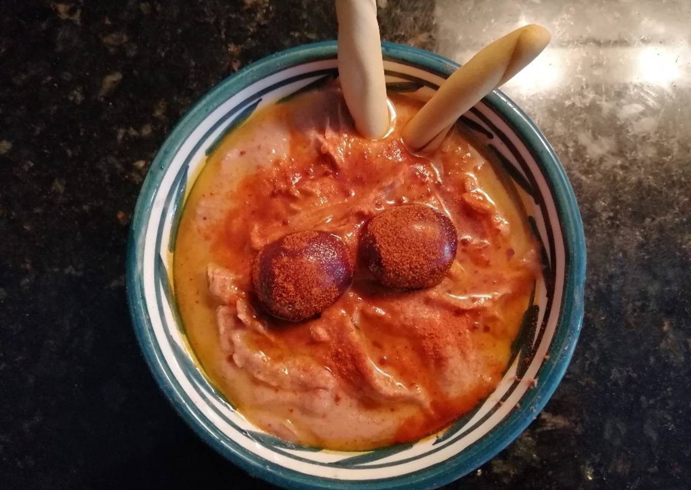- Lo puedes decorar también con unas medias picotas, como en la foto, y para comerse el Hummus unos palitos de pan, zanahoria, apio, tostaditas, ya a gusto de cada uno.