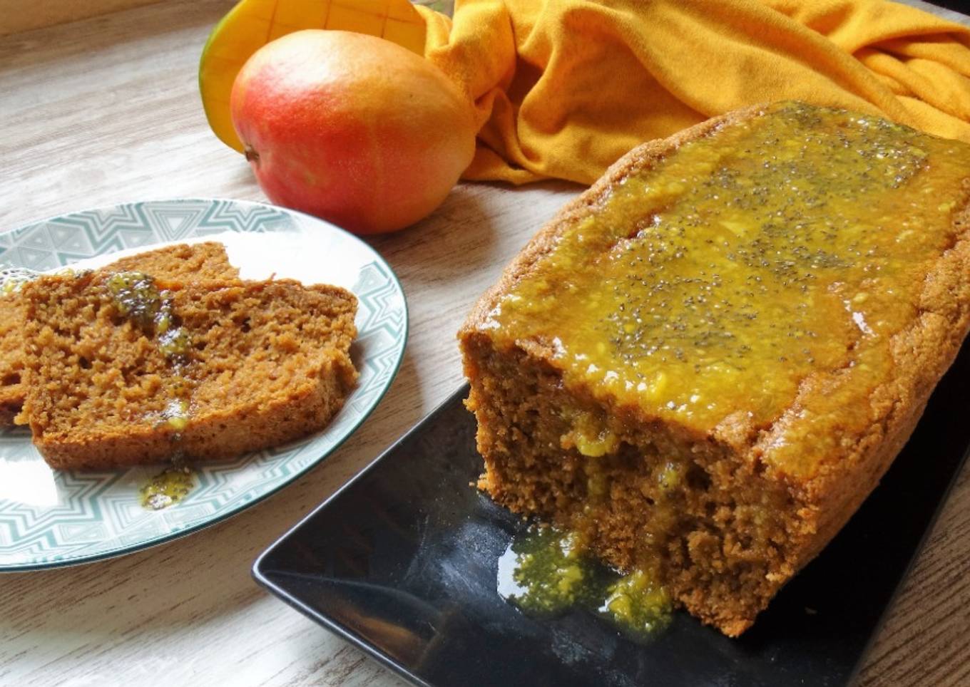 - Preparamos la decoración mezclando las semillas de chía, con el agua, el azúcar glass y el mango triturado. El agua la podéis regular según la consistencia que queráis conseguir. Lo echamos por encima del bizcocho ¡Y listo! Le da un toque aún más jugoso al bizcocho y queda delicioso.