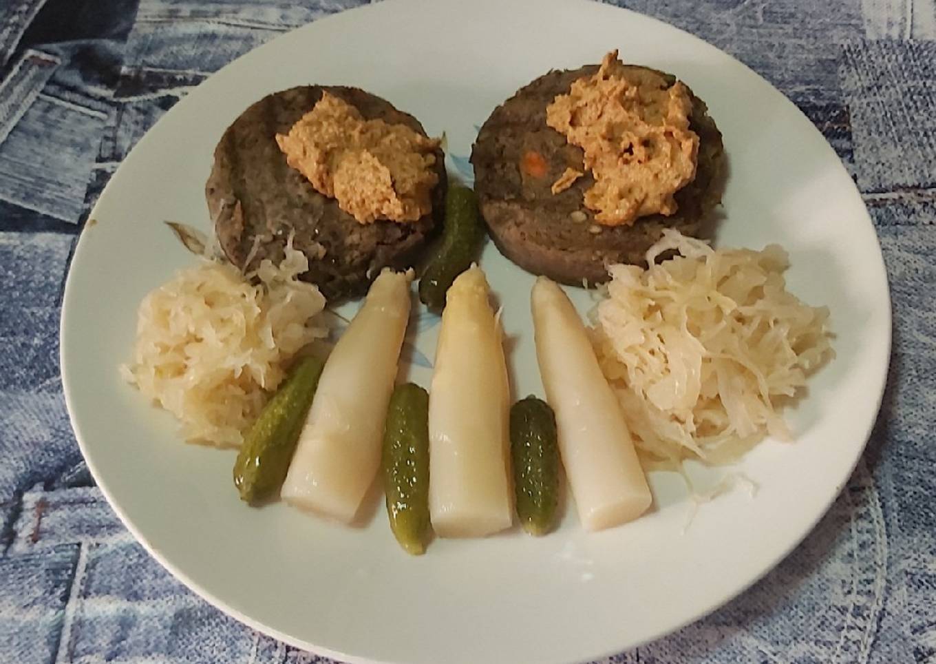 - Y lo acompañamos con un poco de chucrut, unos espárragos, sobrasada casera y pepinillos en vinagre. Bon profit!!!