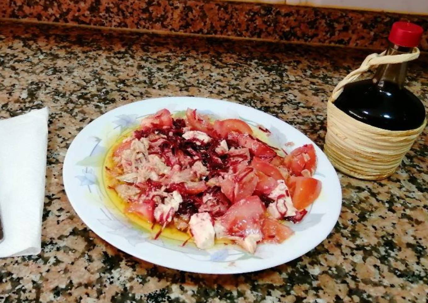 - A continuación añade las remolacha en tiritas, el aceite, la sal y remueve bien y las aceitunas (opcional) yo no he puesto.