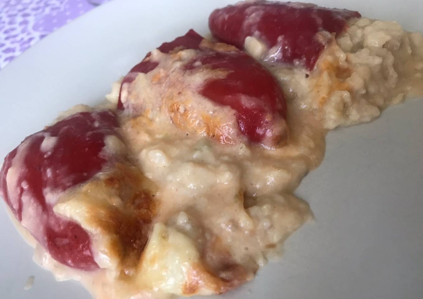 - Para hacer la bechamel de la cobertura ponemos en un cazo la leche y cuando llegue a ebullición le añadimos la harina de avena, removemos hasta que vuelva a hervir y no queden grumos, añadimos la cucharada de tomate frito y la sal. Cubrimos los pimientos rellenos con la bechamel y el queso.