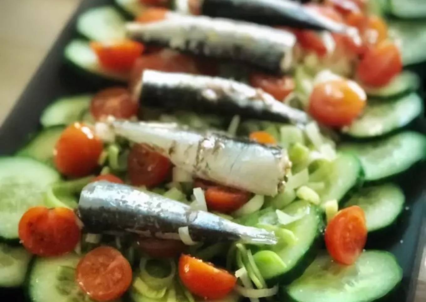 - En un plato amplio, ponemos una cama de pepino, espolvoreamos sal, e incorporamos los tomates y el puerro. Coronamos con las sardinillas y echamos aceite —a nuestro gusto—.