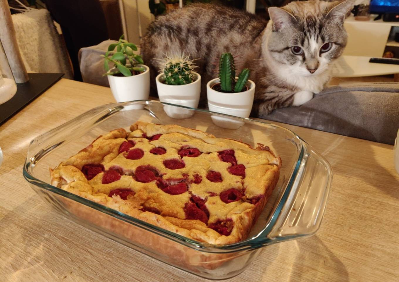 - Cubrimos un molde con papel de horno, y vertemos la mezcla en él. Repartimos por encima las frambuesas que habíamos guardado, e introducimos en el horno a media altura durante unos 40 minutos con calor por arriba y por abajo. Aconsejo vigilar la superfície de la tarta ya que tiende a cocinarse bastante rápido. Si es el caso, cambiad a solo calor por debajo los últimos 5-10 minutos.