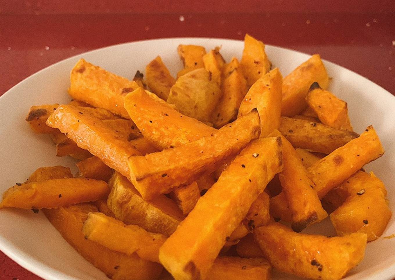- Pela y corta los boniatos en tiras gruesas. Añádelos en un bol y mézclalos con aceite, sal y pimienta.