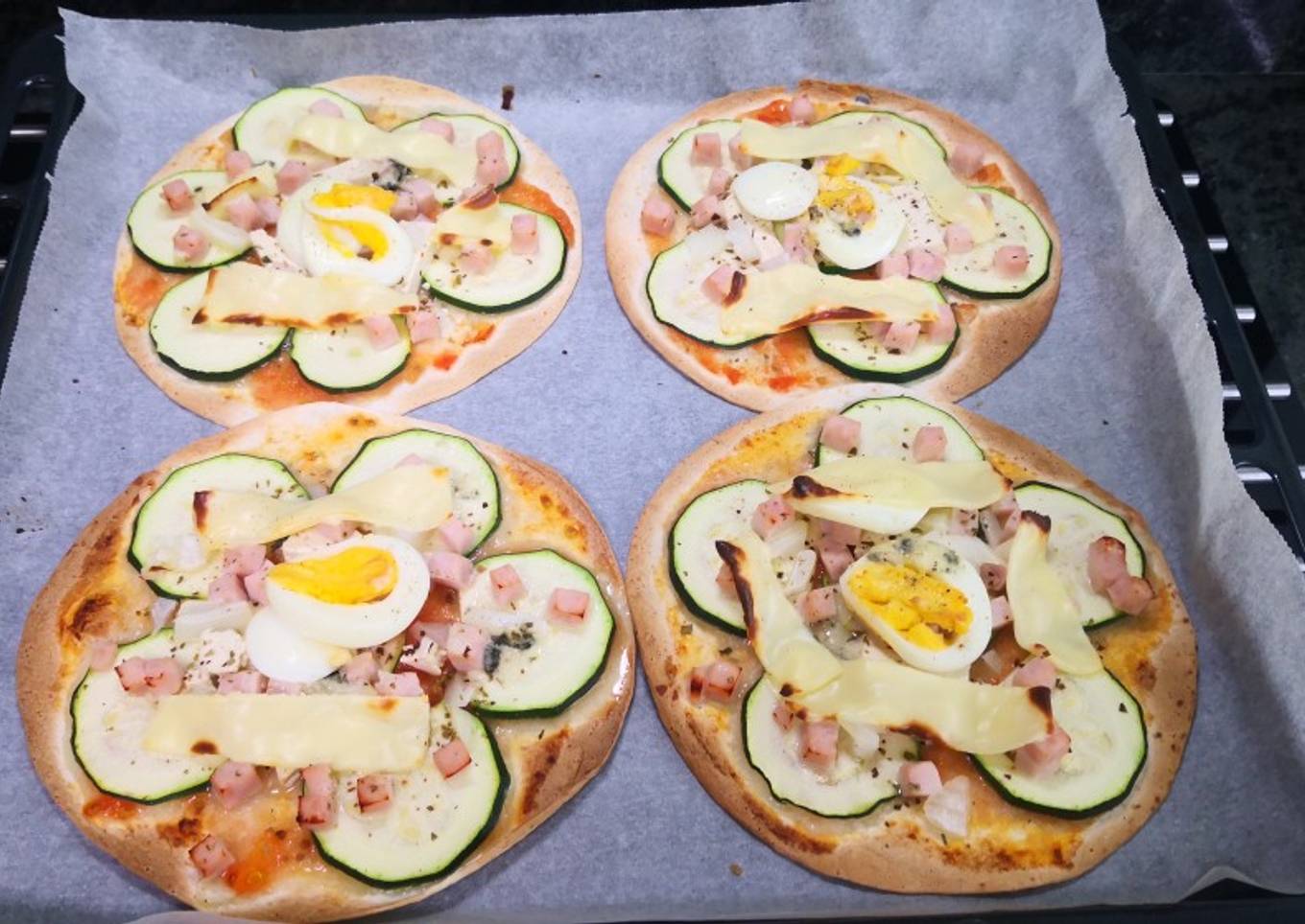 - En una llanda de horno, ponemos papel vegetal y las 4 masas de pizzas. Echamos el tomate rallado y orégano. Después ponemos el calabacín, el jamón cocido, el tofu, el huevo en el centro de la pizza y el queso. Añadimos un poco más de orégano y la pimienta. Metemos en el horno previamente calentado a 190°,durante 10 minutos. No hace falta tenerlo más tiempo ya que el calabacín se hace enseguida y no se toma muy hecho y solo queremos tostar la masa y que se haga el queso.